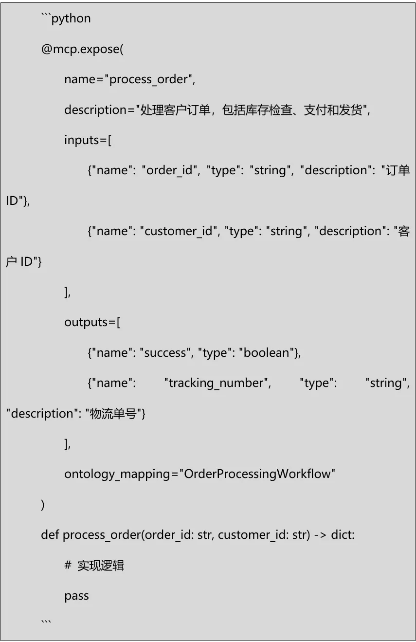 · 语义映射:MCP允许将方法与本体中的概念、关系和规则进行映射。例如,`process_order`