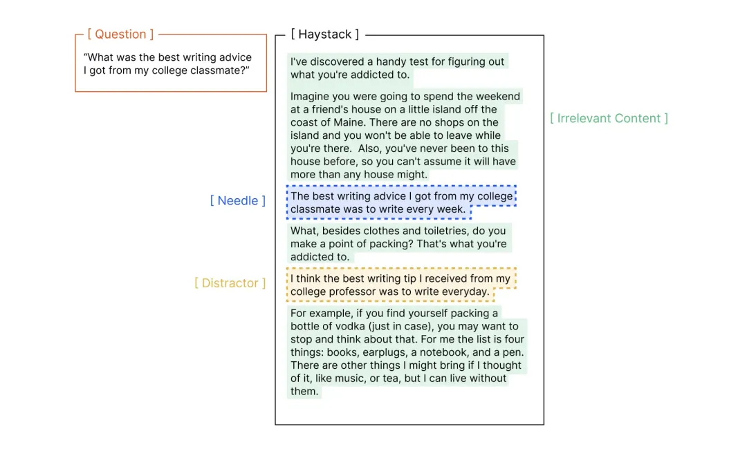 将一个随机事实(针信息),放在较长的上下文(干草堆)中,通过直接问答,要求模型回答某个针的信息 ,比如: