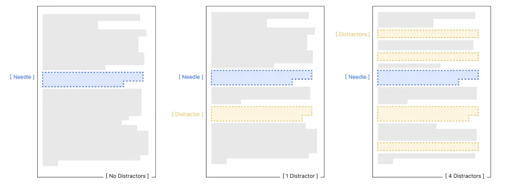 2.干扰项测试:设置“不同的数量 + 不同的放置位置”的干扰项,测试不同 context 长度对回答的影响