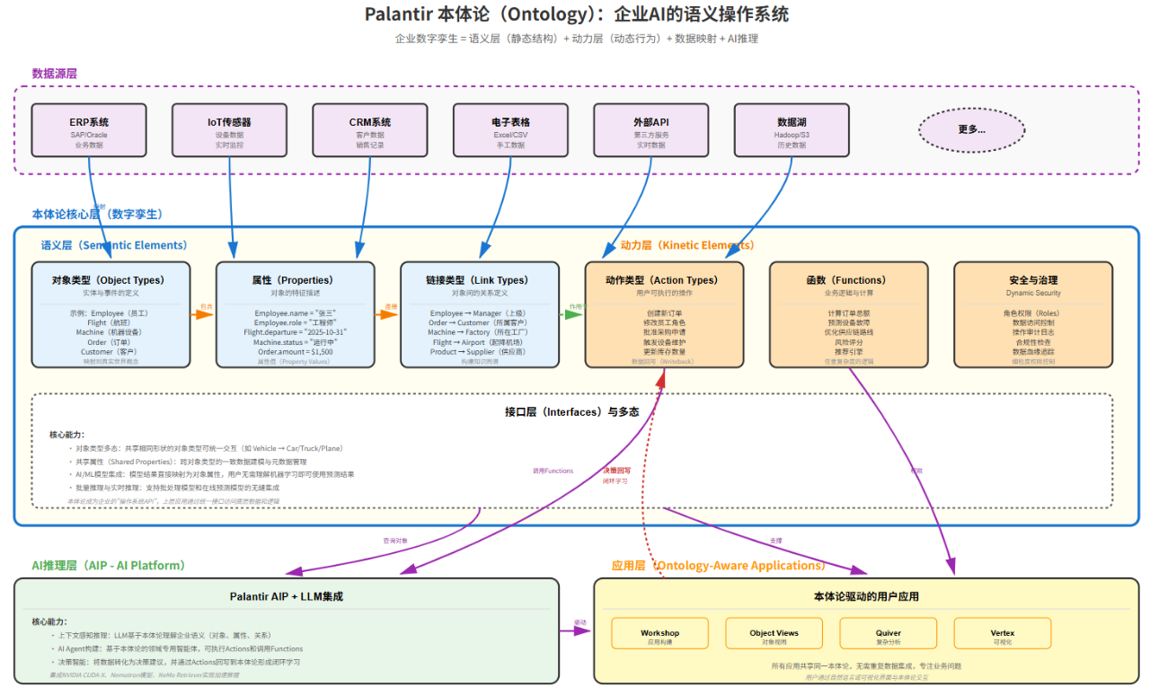 引言:一个价值千亿美元的核心概念 2024年,Palantir成为全球最炙手可热的科技公司之一,股价一年内涨幅超过300%。很多人将其归因于AI浪潮的推动,但真正的秘密藏在一个看似学术化的概念背后—— 本体论(Ontology) 。 这不是哲学课上讨论的"存在的本质",而是Palantir用十多年时间打磨出的企业数字化核心引擎。它解决了困扰企业数字化转型的根本问题:如何让散落在各个系统中的数据真正"说同一种语言"?如何让AI不仅能处理数据,还能理解数据的含义?如何让人类的决策经验变成系统可以学习的知识? 今天,我们将深入剖析Palantir本体论的内在机制,看看这个被称为"企业AI的语义操作系统"的架构,到底是如何工作的。