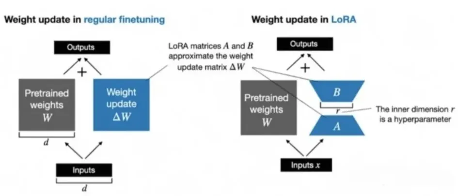 这个过程可以用数学表达式描述为: 新权重=原始权重+AB。