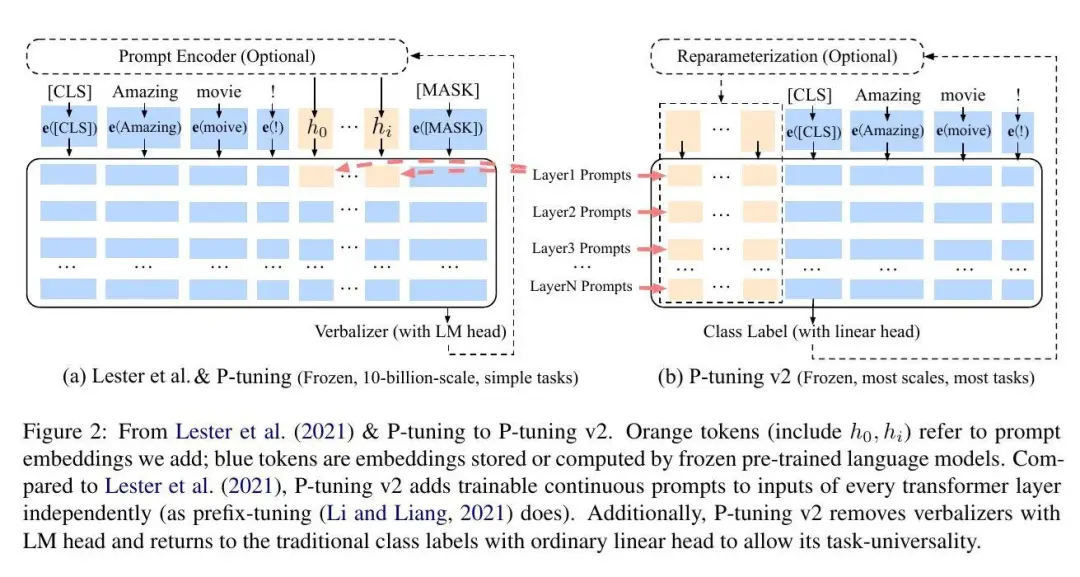 P-Tuning v2的改进在于,不仅在第一层插入连续提示,而是在多层都插入连续提示,且层与层之间的连续提示是相互独立的。
