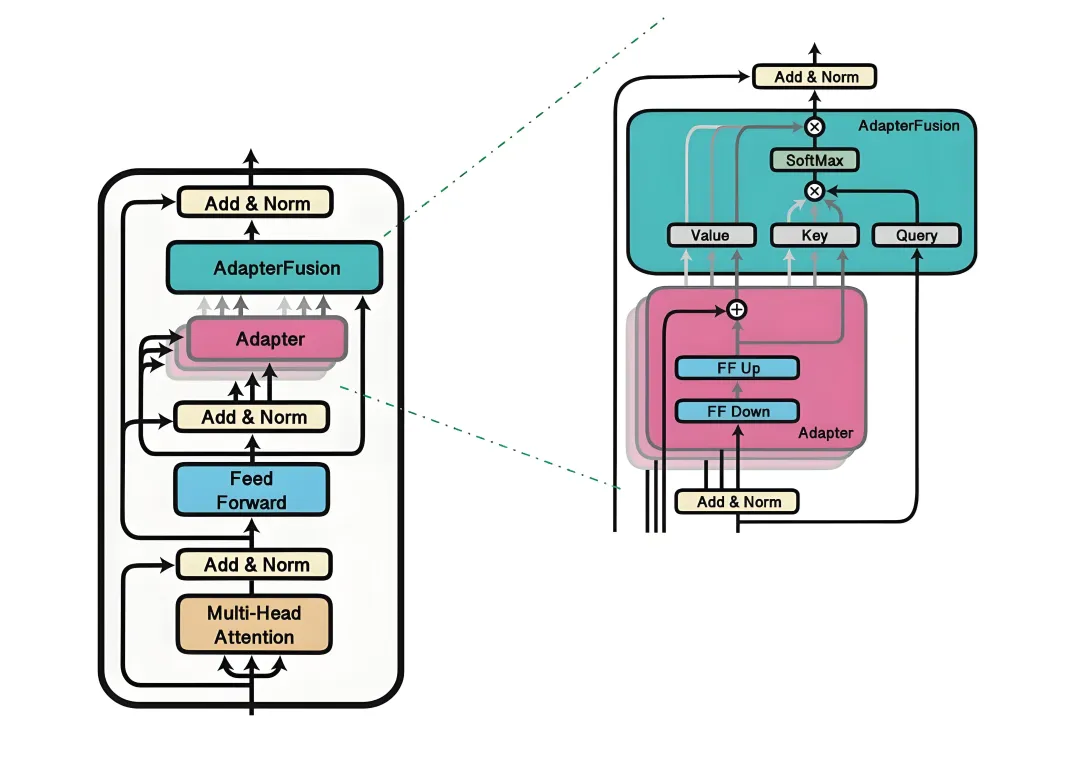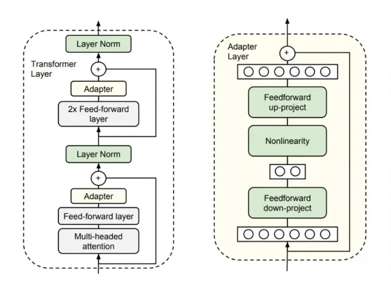 2)适配器调整: 通过在模型各层中添加小型神经网络模块,即“适配器”,来实现微调。