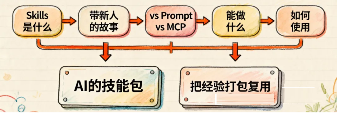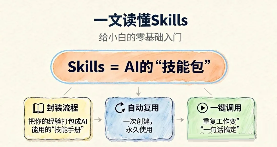 一句话:Skills把你的工作经验和流程,打包成AI可以反复调用的"技能手册"。