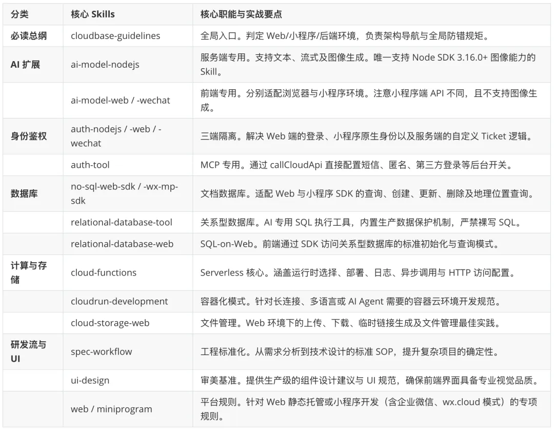 Skills 是软件层面的“岗位手册”,而 CloudBase 则是承载代码落地的“全栈底座”。