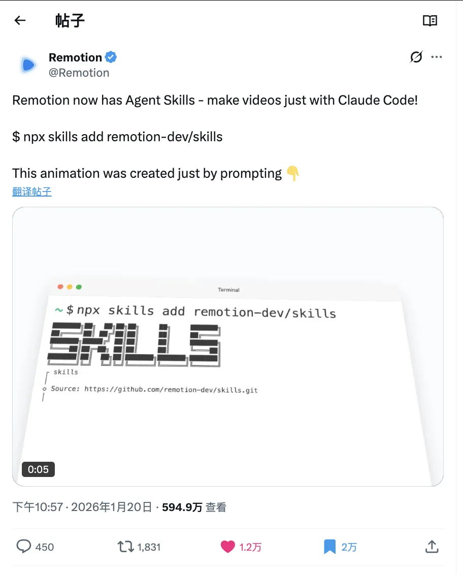 Remotion 推出视频制作 Skill[3],让 AI 学会用代码"剪辑"视频