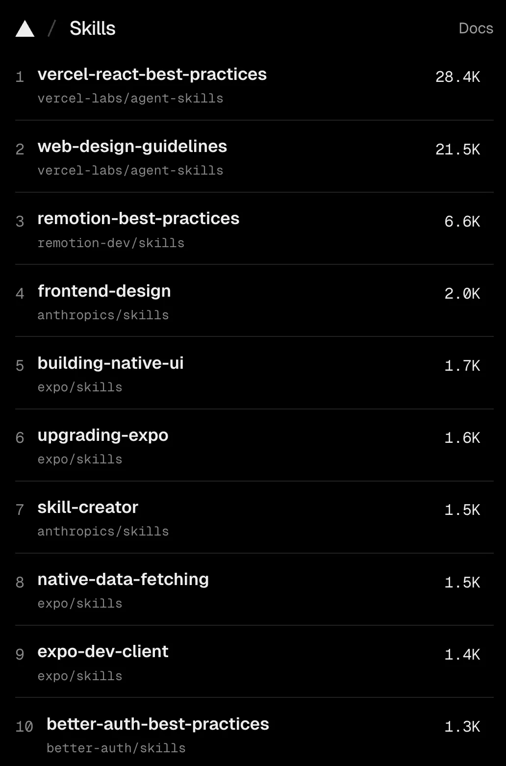 Vercel 推出了 skills 命令[4]来快速安装 Skills 到各个工具中,这是当前热门的