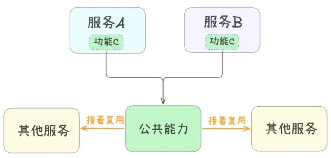 中台一词,常常出现在各种软件架构的设计中,其核心理念用两个字就可以概括:复用,即把相同功能抽离出来,减少重复建设,如下图: