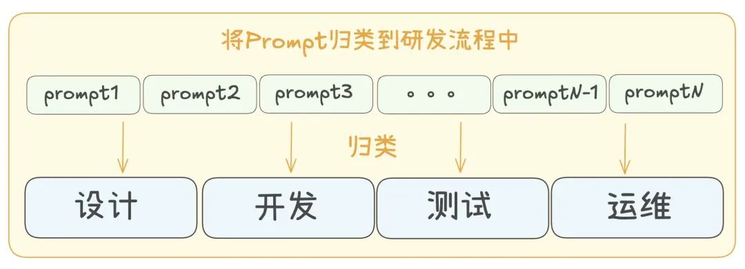 好,我们接着说,如果软件开发的过程就是Prompt的总和!那我们想想,其实软件开发的流程是非常固定的,从设计->开发->测试->运维,那我们就可以把SKIlls按流程进行分类!让它们归到这个框架内。这样我们就拥有了一个识别方法,即面对这成千上万个Skills,我们就可以分区,哦,它对于我们哪些工作环节是帮助的。通过这种方法,我们就可以把好的经验和方法覆盖到软件工程的整个全周期中,做到极致的提效!