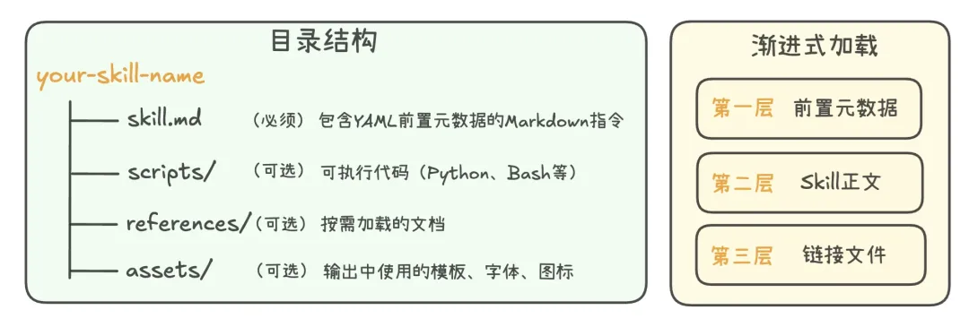 但事情没有那么简单,随着“复用”的增多,当你给AI装上了一大堆的SKills,一个工程化的问题随之而来,我们知道AI在工作的时候,并不是一个无限的资源空间,而是运行在一个特定大小的桌子上(上下文窗口)。试想我们把所有东西都堆在桌面上,桌面就会很乱,结果就是AI开始胡言乱语,幻觉增多,因此,Skills的设计理念是: