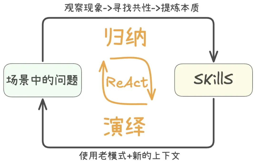 而我们要开发属于自己的Skills,也是这个路子:重复以上两个过程,我们需要先将工作中的案例总结提炼(归纳),固化为Skills,用以应对同类问题(演绎),或是再次反馈完善这个Skills,这便是Skills开发的核心思路!