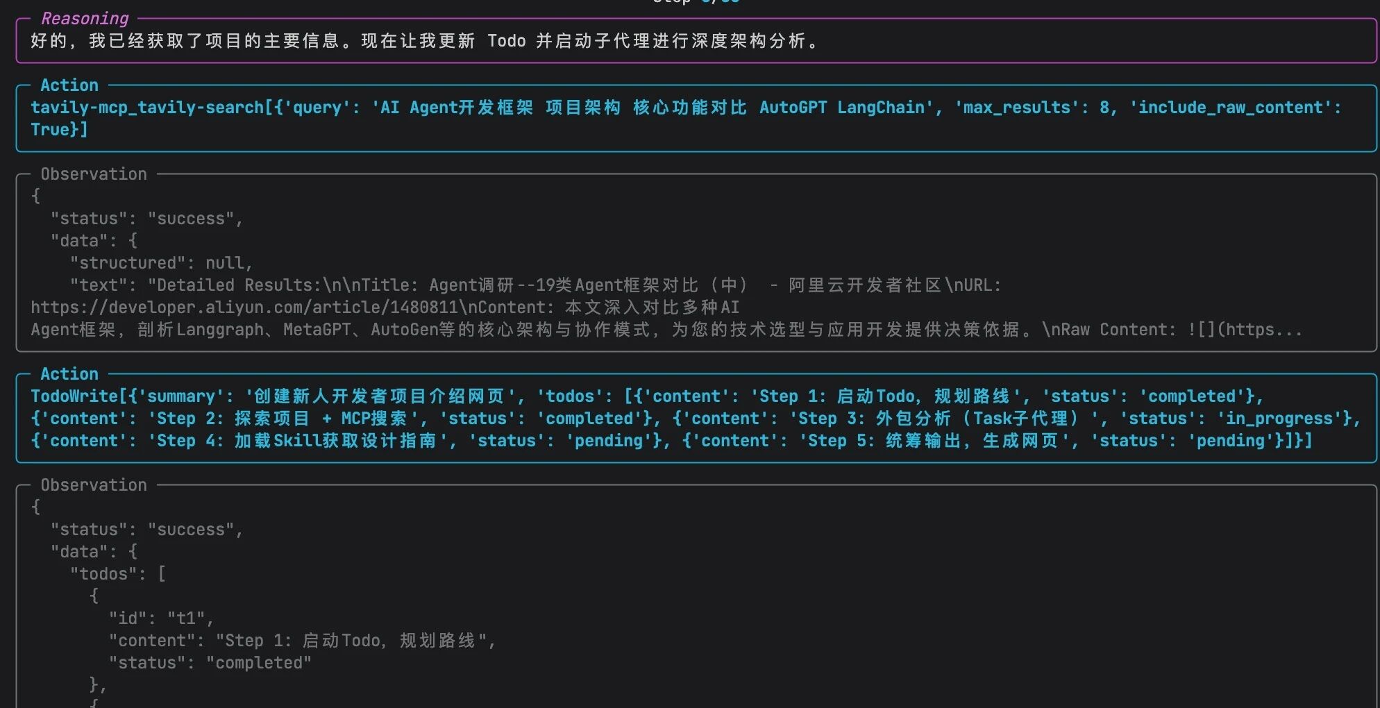 说了那么多,来看个真实例子。我给 MyCodeAgent 安装了 tavily-mcp ,然后布置了一个任务: