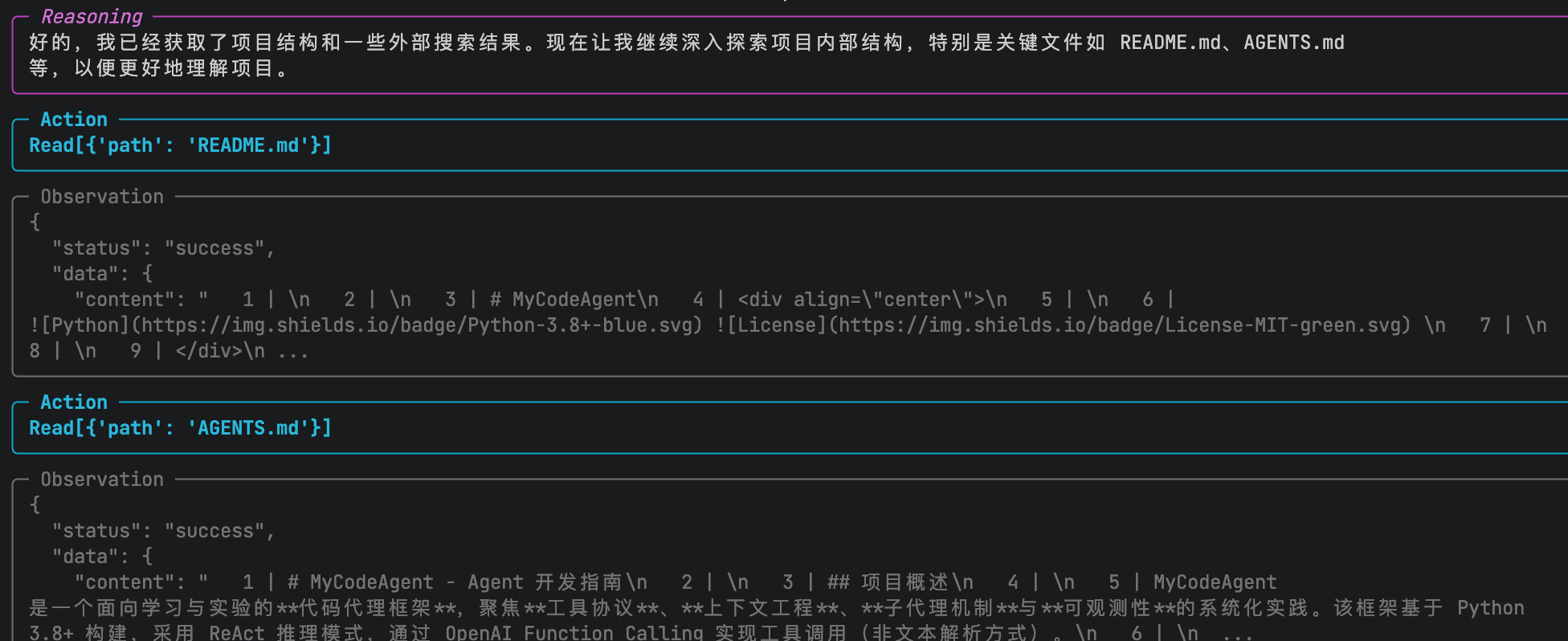 self.react = ReActAgent( name="code_agent", llm=self.llm, tool_registry=self.registry, max_steps=20, # 最多跑 20 步 observation_summarizer=_summarize_observation, summarize_threshold_chars=1800, )