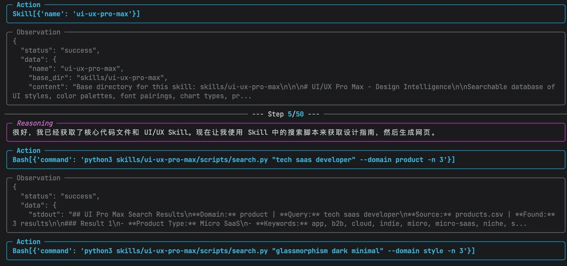 Agent 发现自己有 ui-ux-pro-max 这个 Skill,果断调用: