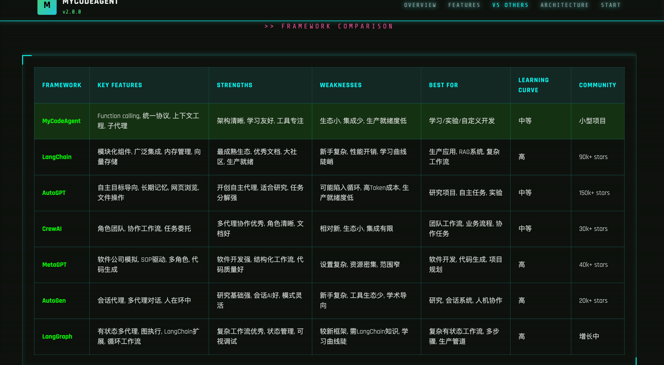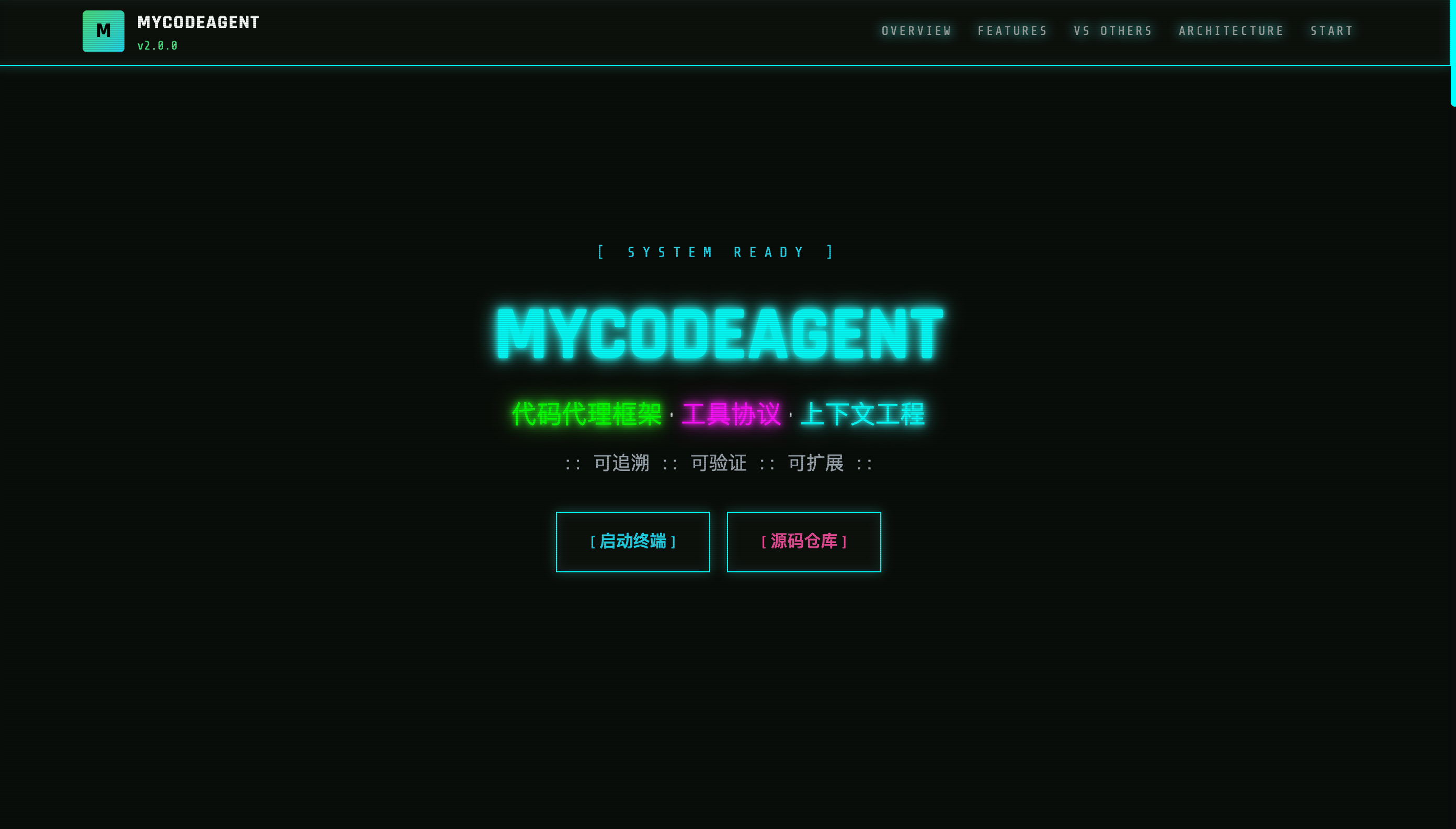 - "MYCODEAGENT" 标题采用 Rajdhani 字体,被青色霓虹光晕(text-shadow 三层叠加)包裹,hover 时触发 故障艺术(Glitch) 动画——文字像老式电视信号不稳定般微微抖动