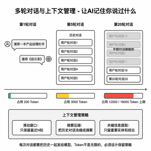 三种上下文保留策略。 Step 一 滑动窗口 ,只保留最近 N 轮对话,简单直接但会忘掉早期重要信息。 Step 二 摘要压缩 ,让模型把早期对话总结成一段摘要放在前面,省 Token 但会丢失细节。 Step 三 关键信息提取 ,把对话中的关键实体和决策单独提取存储,占 Token 最少但实现复杂。