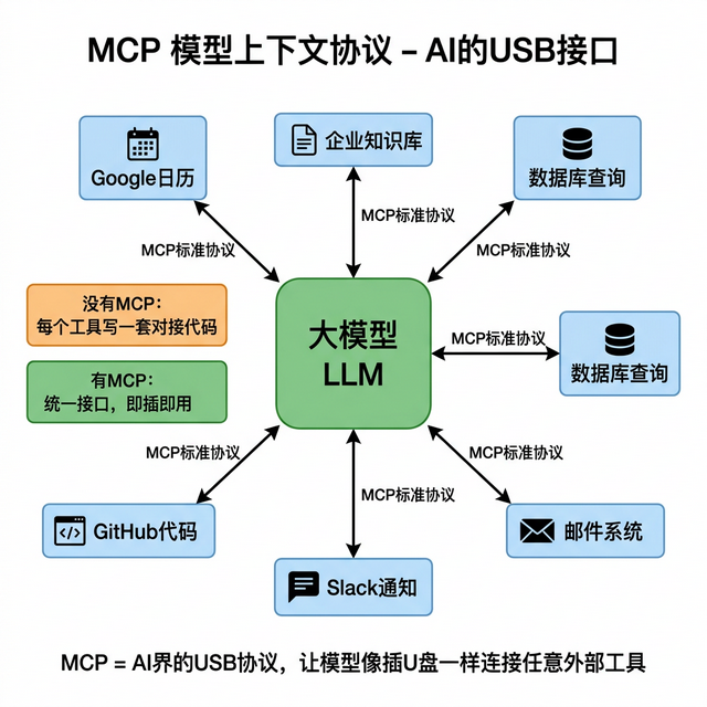 你的 Agent 需要连日历、查数据库、读文件、发邮件,每接一个工具都要写一套对接代码。换个模型供应商,所有对接代码又得重写一遍。对接三个工具花了两周,还有十七个在排期。