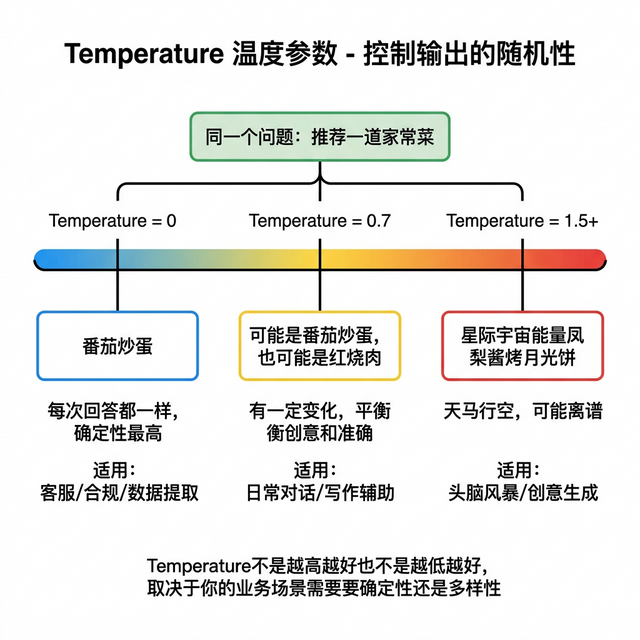 实际产品中的经验,客服场景设 0.1-0.3,你需要回答一致稳定;创意写作场景设 0.7-0.9,你需要多样性;数据提取和格式化场景设 0,你需要结果完全可预测。