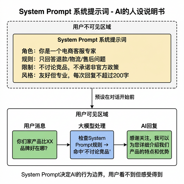 很多 PM 不区分 System Prompt 和用户 Prompt。System Prompt 是对话开始前预设给模型的人设说明书,用户看不到, 但它决定了 AI 的行为模式和能力边界 。每次 API 调用它都会被发送一遍。