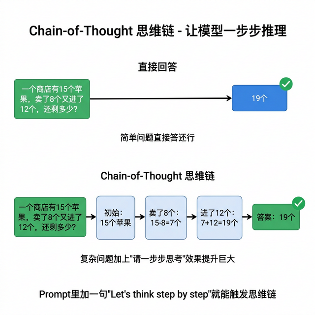 你让 大模型 算一道需要三步推导的应用题,它直接蹦了一个答案,错的。你加了一句请一步步分析,正确率从 40%跳到 80%以上。什么都没改,就多了五个字。