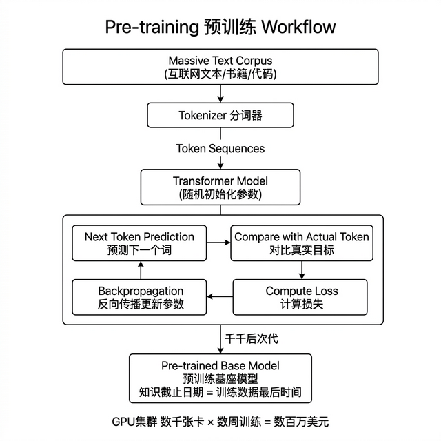 过程的本质很朴素,把互联网上能爬到的文本、书籍、代码、论文全部喂给一个随机初始化的 Transformer 模型,让它反复做一件事——预测下一个词。预测错了就调整参数,调整几万亿次之后,模型就学会了语言规律。这个过程需要数千张 GPU 跑几个月, GPT-4 级别的 预训练 成本超过 1 亿美元。