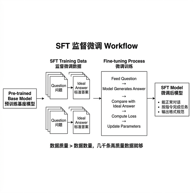SFT 全称 Supervised Fine-Tuning,做法很直接,人工准备几千到几万条问题+标准答案的数据对,让模型学习在收到问题时应该用什么格式、什么风格、什么逻辑来回答。训练完之后模型从文字续写机器变成了问答助手。