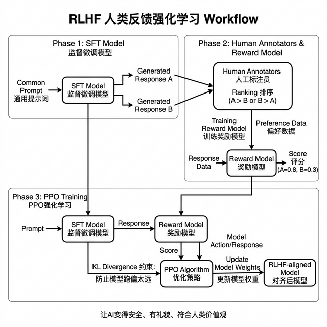 RLHF 全称 Reinforcement Learning from Human Feedback。三步流程。第一步,收集偏好数据,同一个问题让模型生成多个回答,人工标注员对比排序哪个更好。第二步,训练奖励模型,用排序数据训练一个专门打分的模型,让它学会人类标注员的偏好标准。第三步,PPO 强化学习,用奖励模型的打分信号去优化 大模型 ,让它学会生成得分更高的回答。