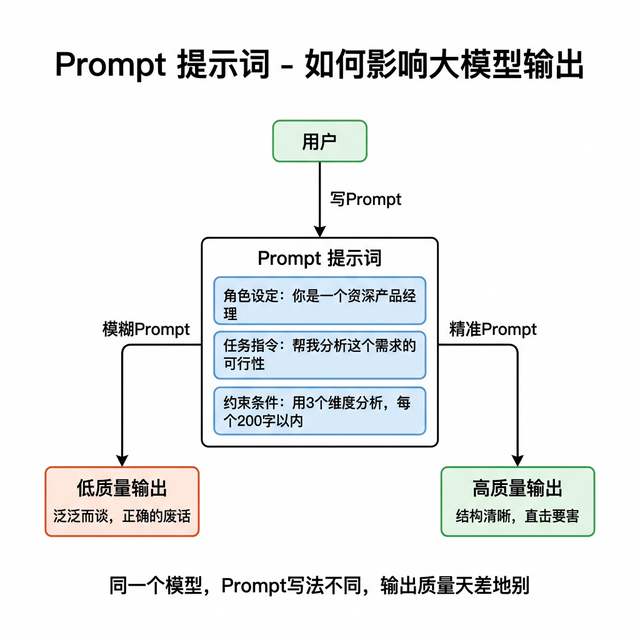 很多 PM 觉得 Prompt 就是随便写句话让模型干活。错。同一个模型,Prompt 写得好和写得差,输出质量能差十倍。Prompt 不是聊天,是下达精确指令。