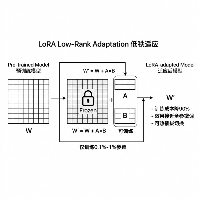 全参 微调 要改模型所有参数,费钱费时间。LoRA 的做法完全不同,冻住原始模型参数不动,在旁边加两个很小的矩阵做增量训练。训练出的结果像一个补丁贴在原模型上,只改了 0.1%-1%的参数,效果却能接近全参微调。