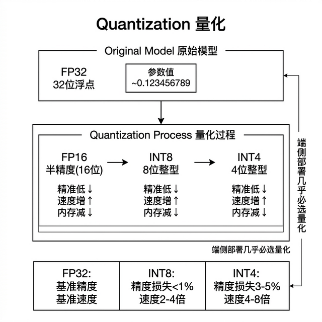量化的核心操作,把模型参数的精度从高位降到低位。通俗讲,原来每个参数用 32 位浮点数存储,量化到 INT8 就只用 8 位,量化到 INT4 只用 4 位。精度降了,但体积也缩了。7B 模型 FP32 需要 28GB 显存,INT8 只要 7GB,INT4 只要 3.5GB。精度损失通常在 1%-5%之间。
