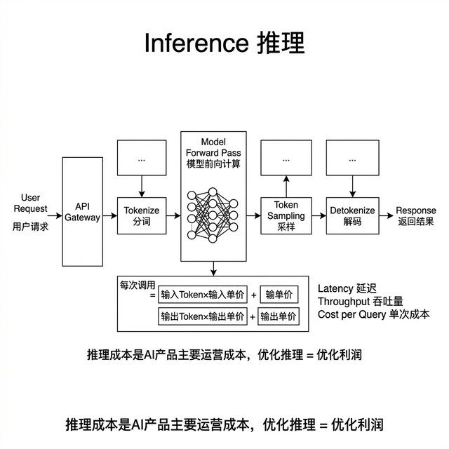 训练是一次性投入,推理是持续性支出。 模型训练好之后每用一次就是一次推理 ,每次推理都要花钱。一个 AI 产品上线后,90%以上的成本都花在推理上。