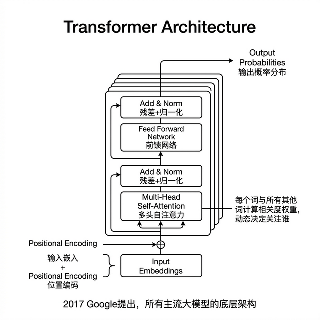 所有主流 大模型 的底层都是 Transformer 架构,2017 年 Google 提出。PM 不需要懂数学,但需要懂它的两个核心特性对产品的影响。
