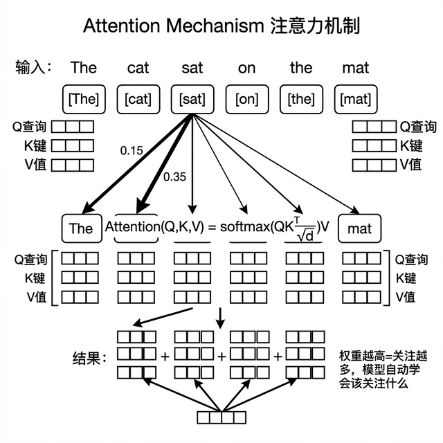 Attention 是 Transformer 的核心引擎 。模型生成每个词时,会计算它跟所有其他词的相关度,给最相关的词更高权重。比如处理我昨天在北京吃了一碗很好喝的豆汁时,生成好喝的时候注意力重点放在豆汁和吃了上,而不是昨天和北京。模型自动学会了该关注什么。