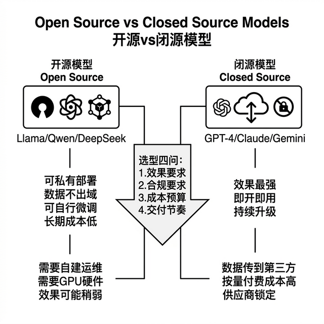 选型我一般问四个问题。 Step 一 合规是否限制数据外传?限制就必须开源私有部署 ,。 Step 二 场景是否需要最前沿推理能力?需要就先用闭源 ,。 Step 三 日均调用量多大?高频调用开源长期更省 ,。 Step 四 时间压力多大?两周上线选闭源 API ,半年规划走开源。