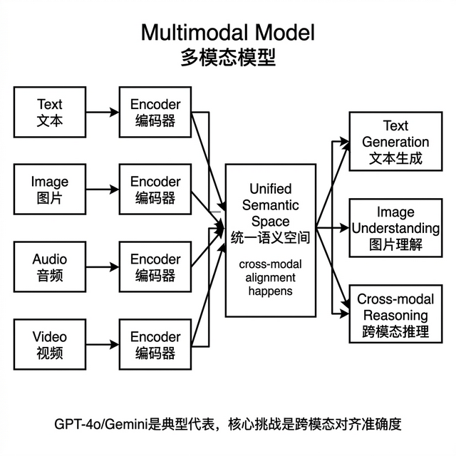 底层三步,各模态独立编码,图片用视觉编码器、文字用文本编码器 → 跨模态对齐,把不同模态的特征映射到同一个语义空间 → 在共享空间完成推理和生成。