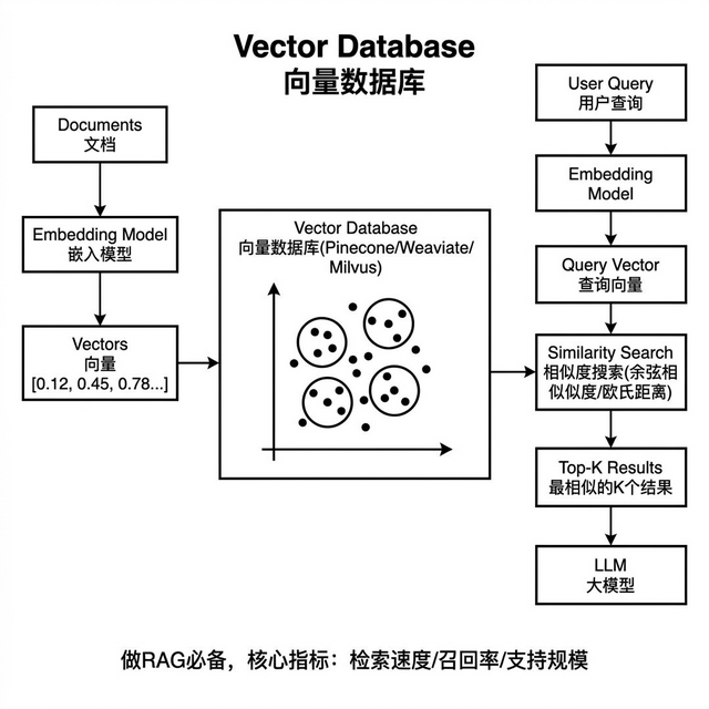 向量数据库 是专门为高维向量检索设计的数据库。核心能力,在百万甚至亿级向量中做最近邻搜索,速度在毫秒级。传统数据库做不到这个速度。