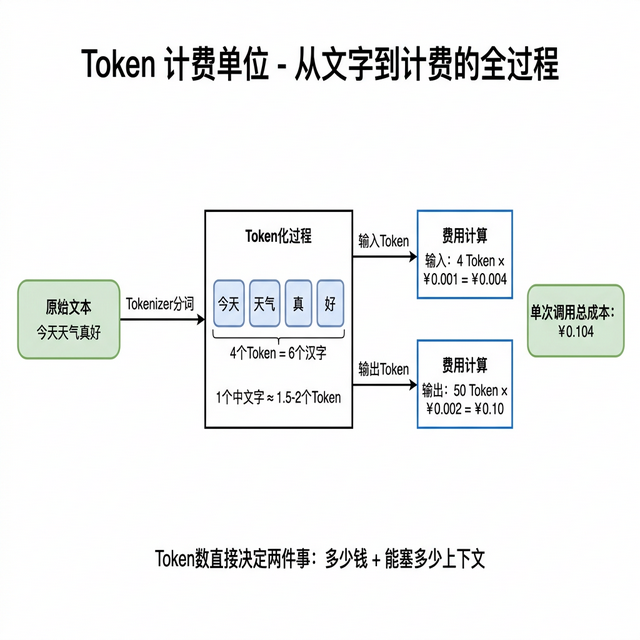 Token 是 大模型 处理文本的最小单位。英文里一个词大约 1-1.5 个 Token,中文更贵,一个汉字大约 1.5-2 个 Token。API 按照输入 Token 和输出 Token 分别计费,输出通常比输入贵 2-4 倍。