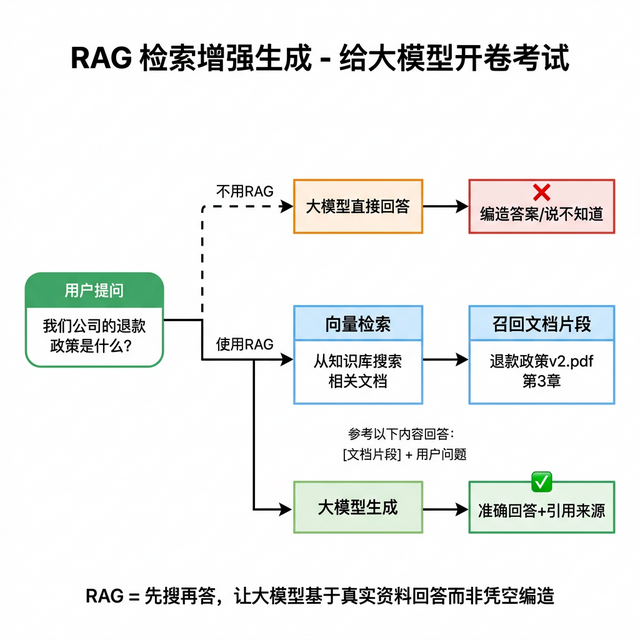 RAG 就是解决这个问题的,核心思路四个字, 开卷考试 。每次用户提问时,系统先从你的 知识库 里搜出最相关的文档片段,塞进 Prompt 里,让模型基于这些真实资料来回答。模型自己不知道的东西,你帮它找到原文让它照着答就行了。