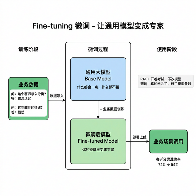 你用 Prompt+RAG 搞了两个月,客服机器人的回复风格始终不像真人客服,怎么调 Prompt 都约束不住。算法同事说试试 微调 吧。你一脸懵, 微调 和 RAG 到底什么区别?什么时候该用哪个?