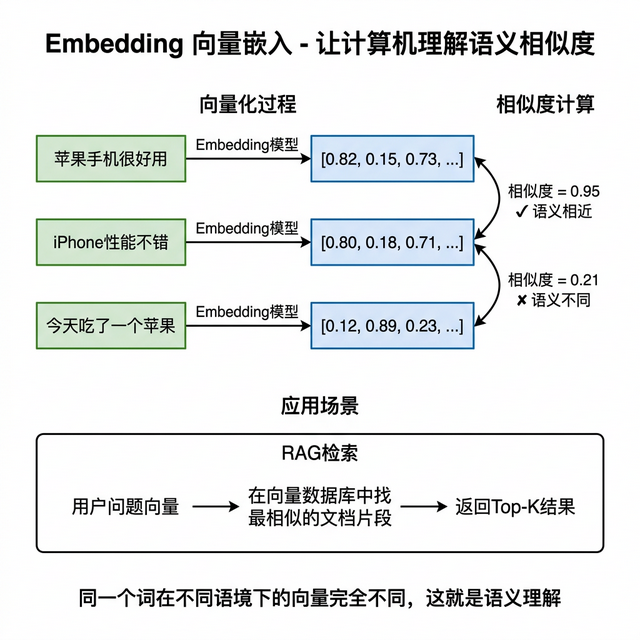 传统搜索靠关键词匹配,有就有没就没,不理解意思。Embedding 把文字变成一串数字,也就是向量,用数学方式表示语义。意思相近的文字向量距离近,意思不同的距离远。