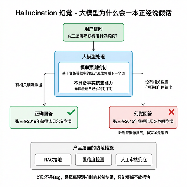 为什么 幻觉 无法根治?因为模型的生成机制就是预测最可能的下一个 Token。什么叫最可能?基于训练数据中的统计规律。如果训练数据里退款这个词后面经常跟 7 天,模型就会倾向于输出 7 天。它不关心这对你的业务是不是正确的。
