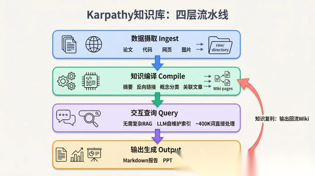 Karpathy的知识库系统并不复杂,核心就是一条四层流水线: