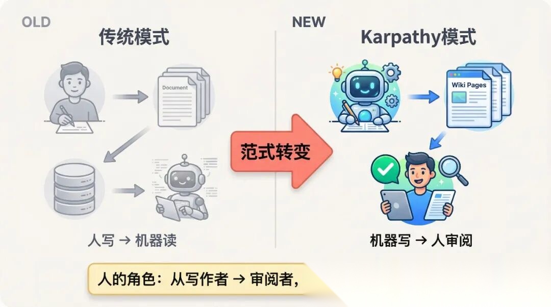 Karpathy模式:LLM生成内容 → 人审阅修正 → LLM持续维护