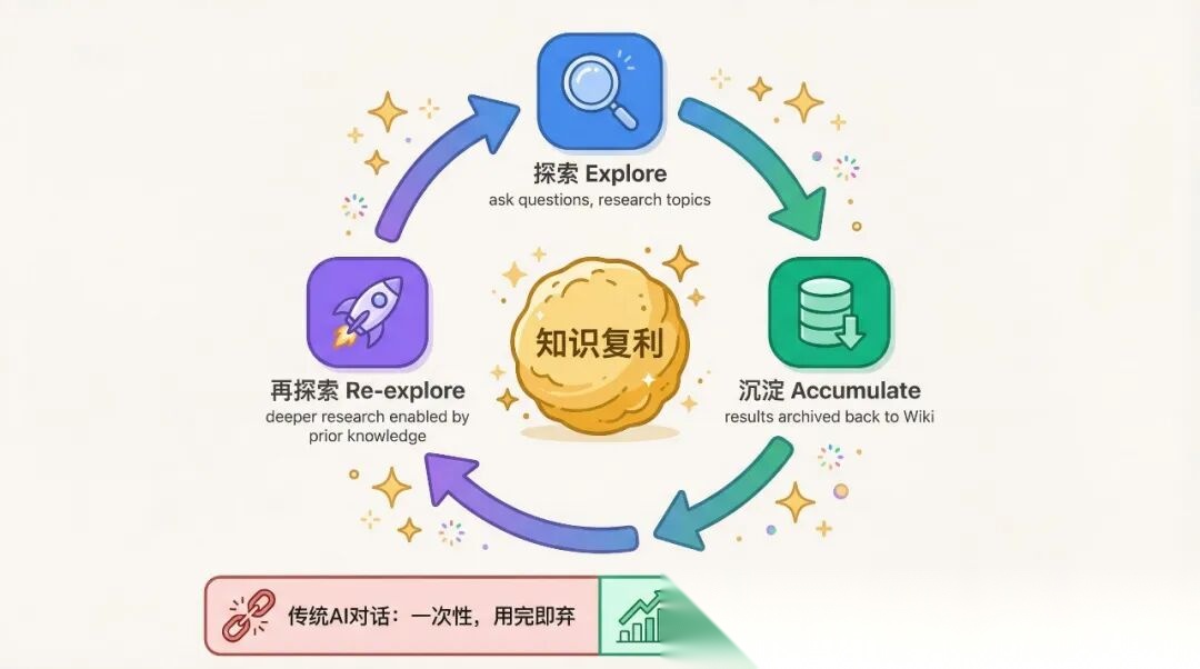 每次查询的结果都会被"归档"回Wiki,形成一个闭环:探索 → 沉淀 → 再探索。