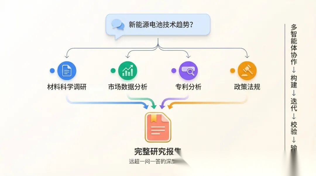 这远超"一问一答"的浅层交互。想象一下:你问"新能源汽车的电池技术发展趋势是什么",系统不是给你一段回答,而是多个Agent分头去调研材料科学、市场数据、专利分析、政策法规,最后汇总成一份媲美咨询公司报告的深度文档。