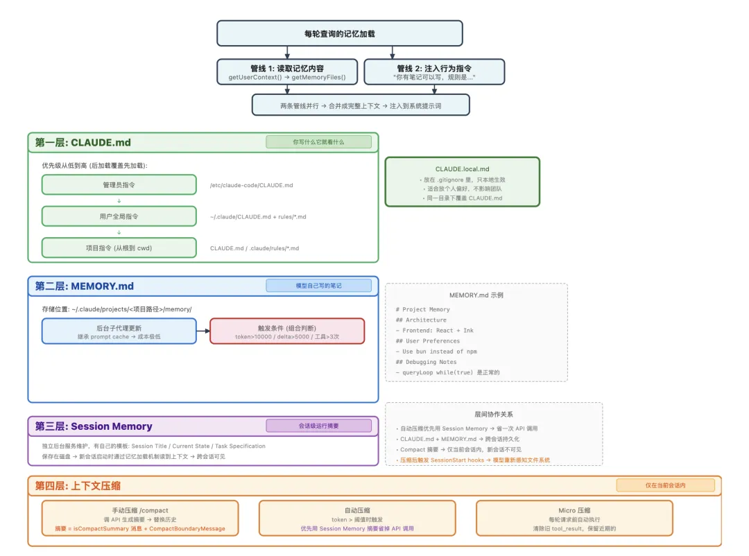 多层记忆的协作。 CLAUDE.md、MEMORY.md、Session Memory、Compact