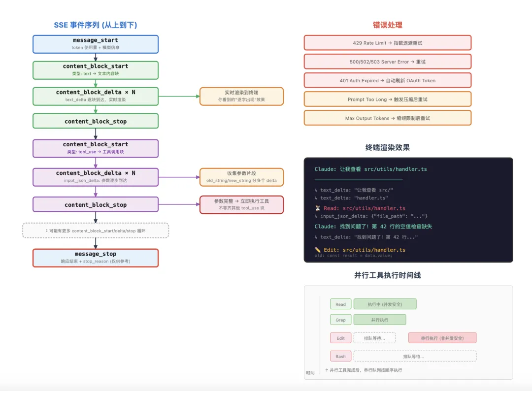 每收到一个 text_delta 事件,文本就立即渲染到终端,你看到的"一个字一个字出现"的效果就是这么来的。