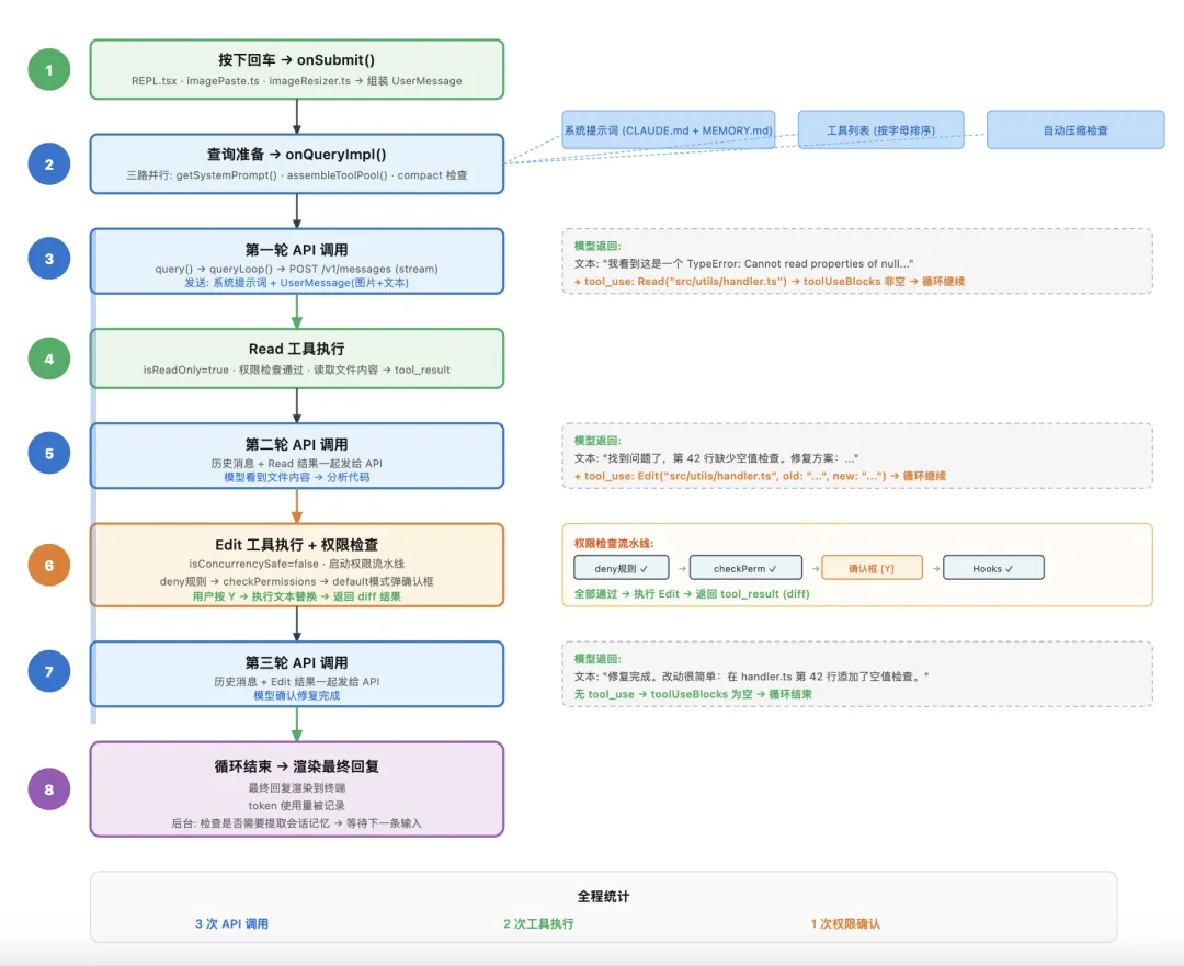 调用和工具执行,通过了权限检查,最终带着修复结果回到了你的终端。