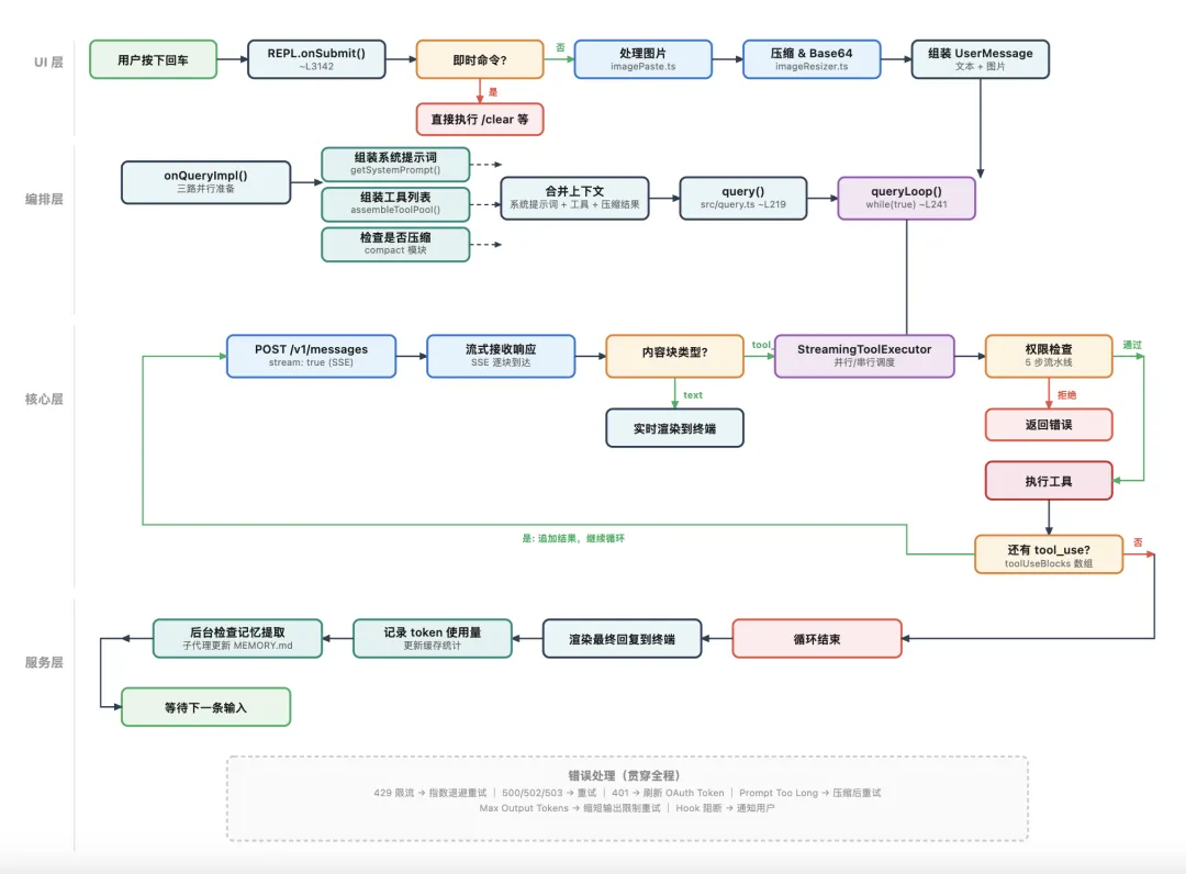 总结一下,我们为了更好的理解 Claude Code 的架构,追了一条消息的生命周期:从在终端里按下回车,到图片被处理、系统提示词被组装、工具被加载、查询循环开始转动,再到权限检查、记忆提取、上下文压缩、流式返回,最后把结果送回屏幕。