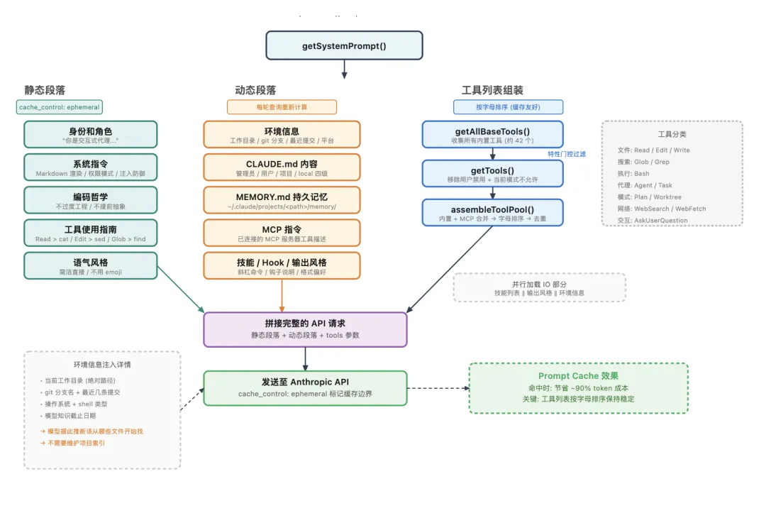 系统提示词组装流程:静态段落(缓存友好)+